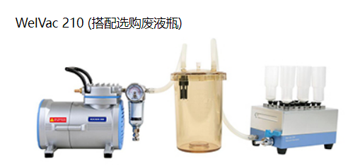 WelVac 210 結(jié)合真空源成為一套完整的真空純化系統(tǒng),全套包含Rocker 300 無油式真空泵、連接硅膠管、廢液收集盒,若使用大容量離心管時亦可選購廢液瓶以收集大量廢液。
